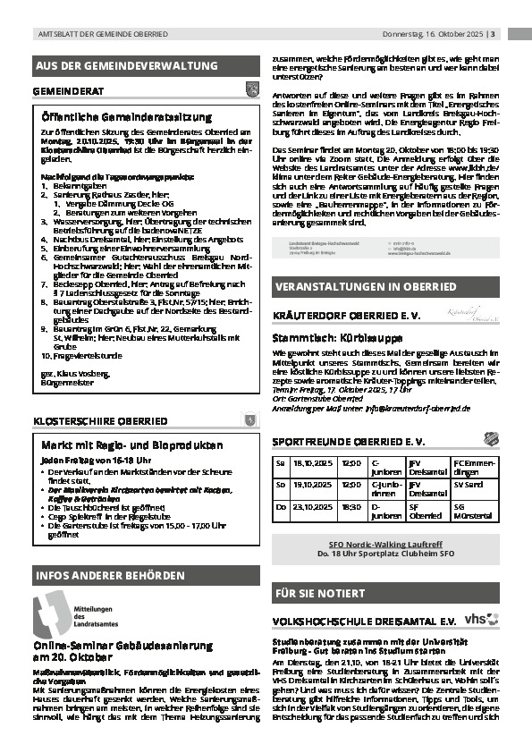 Einladung zur Mitgliederversammlung der Bürgergemeinschaft Oberried zum zehnjährigen Jubiläum am Freitag, 17. Oktober 2025, um 19:00 Uhr