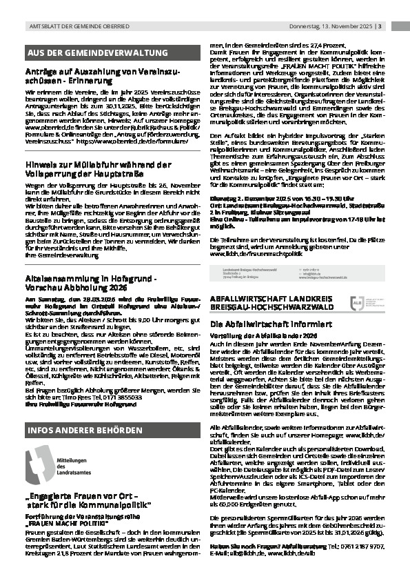Aufgrund eines Kabelschadens ist die Gemeindeverwaltung Oberried derzeit telefonisch nicht erreichbar. Wir bitten Sie, uns in dringenden Fällen eine E-Mail zu schreiben. Bitte geben Sie dabei Ihre Telefonnummer an, damit wir Sie zeitnah zurückrufen können. Vielen Dank für Ihr Verständnis! Ihre Gemeindeverwaltung Oberried