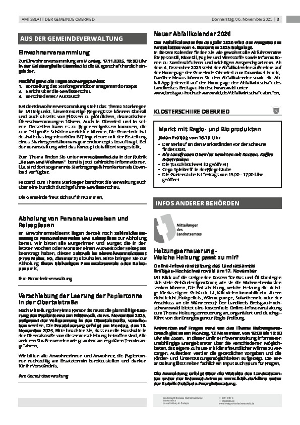 Zur Einwohnerversammlung am Montag, 17.11.2025, 19:30 Uhr in die Goldberghalle Oberried ist die Bürgerschaft herzlich eingeladen. Bei der Einwohnerversammlung steht das Thema Starkregen im Mittelpunkt. Unwetterartige Regengüsse können überall und auch abseits von Flüssen zu plötzlichen, dramatischen Überschwemmungen führen. Auch in Oberried und in seinen Ortsteilen kann es zu Regenereignissen kommen, die zum Teil große Schäden anrichten können. Die Gemeinde hat deshalb das Ingenieurbüro BIT Ingenieure mit der Erstellung eines Starkregenrisikomanagementkonzepts beauftragt. Bei der Veranstaltung wird das Konzept detailliert vorgestellt. Passend zum Thema Starkregen berichtet die Verwaltung auch über eine kürzlich durchgeführte Gewässerschau. Die Gemeinde freut sich auf Ihr Kommen.