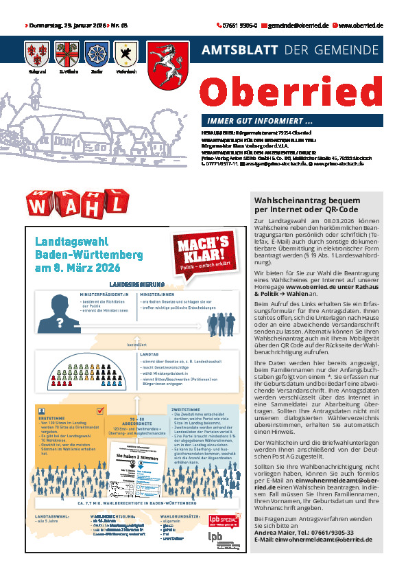 Die Wahlbenachrichtigungen werden voraussichtlich bis spätestens 6. Februar 2026 per Post an alle wahlberechtigten Bürgerinnen und Bürger versandt. Die Wahlbenachrichtigung enthält wichtige Informationen zur Stimmabgabe sowie zum zuständigen Wahllokal.