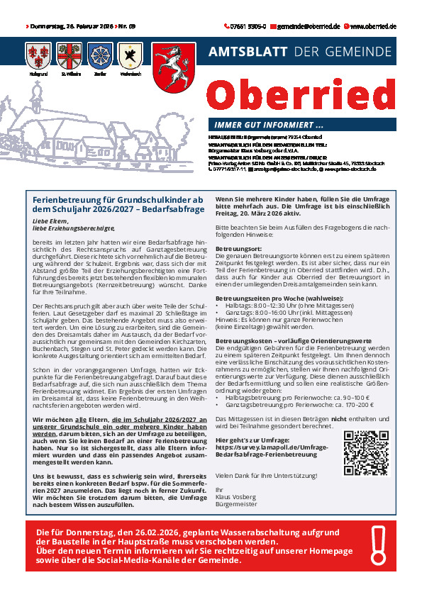 Alle Eltern, deren Kinder im Schuljahr 2026/2027 die Grundschule besuchen, werden gebeten, sich an der aktuellen Umfrage zur Ferienbetreuung zu beteiligen. Die Umfrage ist bis einschließlich Freitag, 20. März 2026, freigeschaltet.