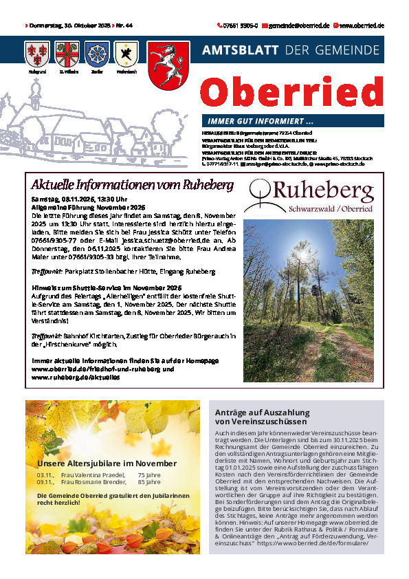 Auch in diesem Jahr können wieder Vereinszuschüsse beantragt werden. Die Unterlagen sind bis zum 30.11.2025 beim Rechnungsamt der Gemeinde Oberried einzureichen. Zu den vollständigen Antragsunterlagen gehören eine Mitgliederliste mit Namen, Wohnort und Geburtsjahr zum Stichtag 01.01.2025 sowie eine Aufstellung der zuschussfähigen Kosten nach den Vereinsförderrichtlinien der Gemeinde Oberried mit den entsprechenden Nachweisen. Die Aufstellung ist vom Vereinsvorsitzenden oder dem Verantwortlichen der Gruppe auf ihre Richtigkeit zu bestätigen. Bei Sonderförderungen sind dem Antrag die Originalbelege beizufügen. Bitte berücksichtigen Sie, dass nach Ablauf des Stichtages, keine Anträge mehr angenommen werden können.