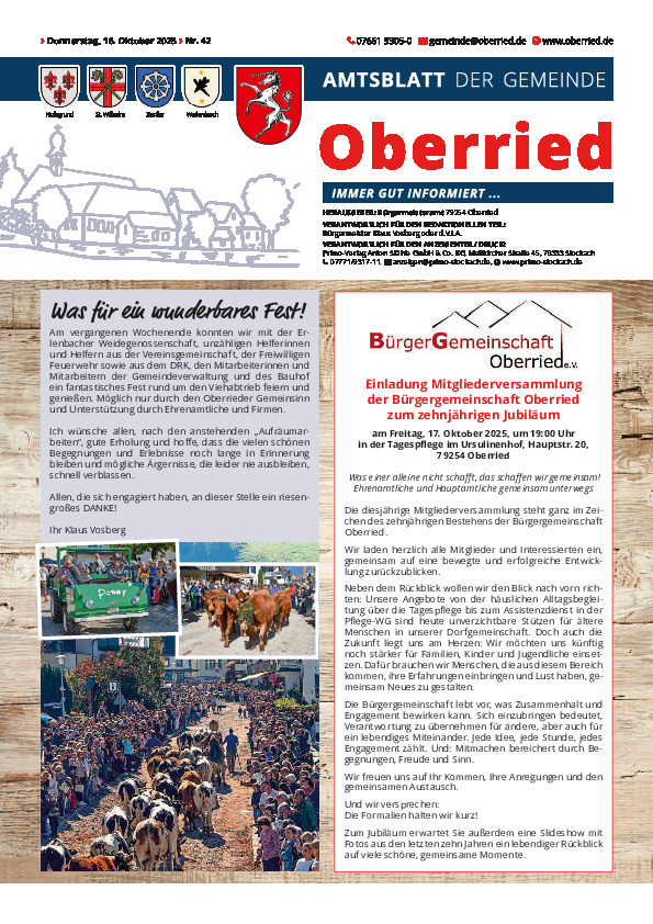 Am vergangenen Wochenende konnten wir mit der Erlenbacher Weidegenossenschaft, unzähligen Helferinnen und Helfern aus der Vereinsgemeinschaft, der Freiwilligen Feuerwehr sowie aus dem DRK, den Mitarbeiterinnen und Mitarbeitern der Gemeindeverwaltung und des Bauhof ein fantastisches Fest rund um den Viehabtrieb feiern und genießen. Möglich nur durch den Oberrieder Gemeinsinn und Unterstützung durch Ehrenamtliche und Firmen. Ich wünsche allen, nach den anstehenden „Aufräumarbeiten“, gute Erholung und hoffe, dass die vielen schönen Begegnungen und Erlebnisse noch lange in Erinnerung bleiben und mögliche Ärgernisse, die leider nie ausbleiben, schnell verblassen. Allen, die sich engagiert haben, an dieser Stelle ein riesengroßes DANKE!