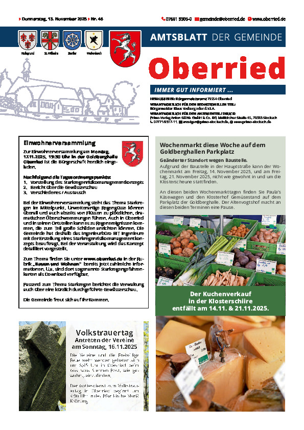 Aufgrund eines Kabelschadens ist die Gemeindeverwaltung Oberried derzeit telefonisch nicht erreichbar. Wir bitten Sie, uns in dringenden Fällen eine E-Mail zu schreiben. Bitte geben Sie dabei Ihre Telefonnummer an, damit wir Sie zeitnah zurückrufen können. Vielen Dank für Ihr Verständnis! Ihre Gemeindeverwaltung Oberried