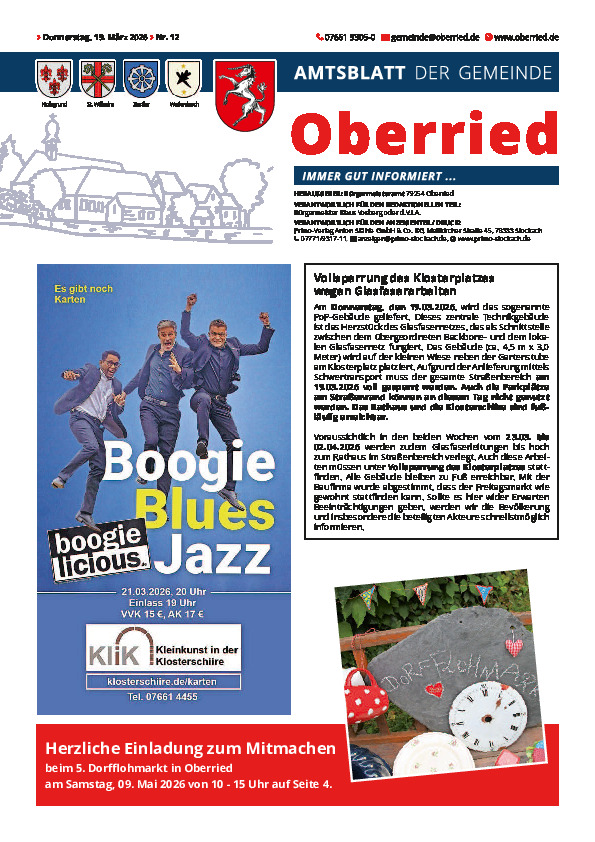 Am Donnerstag, 19.03.2026, wird das sogenannte PoP-Gebäude als zentrale Technikstation für das Glasfasernetz am Klosterplatz geliefert und aufgestellt. Für die Anlieferung per Schwertransport muss der Straßenbereich an diesem Tag voll gesperrt werden; Parkplätze am Straßenrand stehen nicht zur Verfügung. Zwischen dem 23.03. und voraussichtlich 02.04.2026 werden zudem Glasfaserleitungen bis zum Rathaus verlegt, wofür der Klosterplatz ebenfalls voll gesperrt wird. Gebäude bleiben zu Fuß erreichbar, der Freitagsmarkt soll wie gewohnt stattfinden.