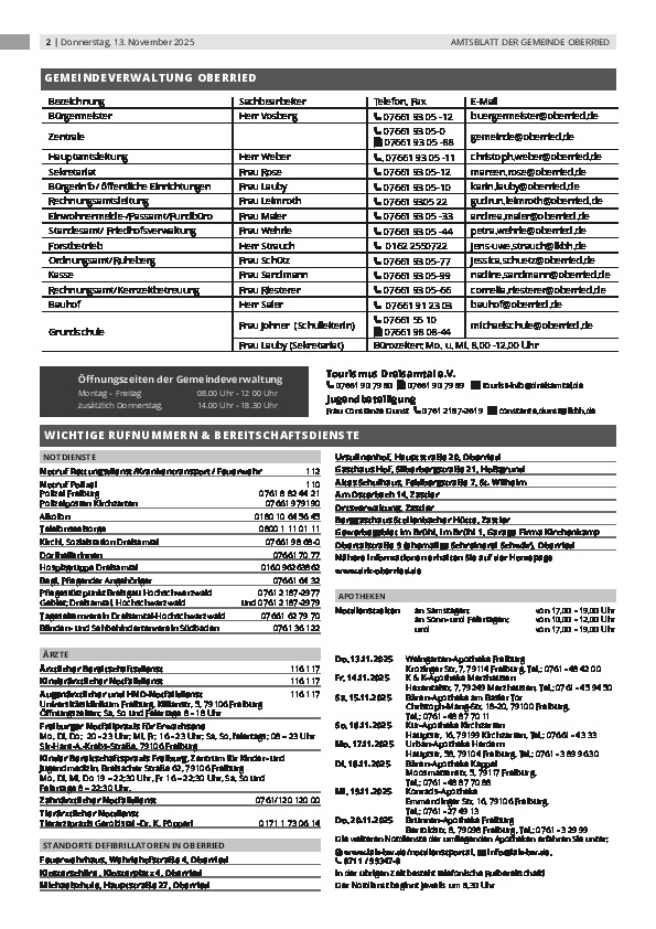 Aufgrund eines Kabelschadens ist die Gemeindeverwaltung Oberried derzeit telefonisch nicht erreichbar. Wir bitten Sie, uns in dringenden Fällen eine E-Mail zu schreiben. Bitte geben Sie dabei Ihre Telefonnummer an, damit wir Sie zeitnah zurückrufen können.